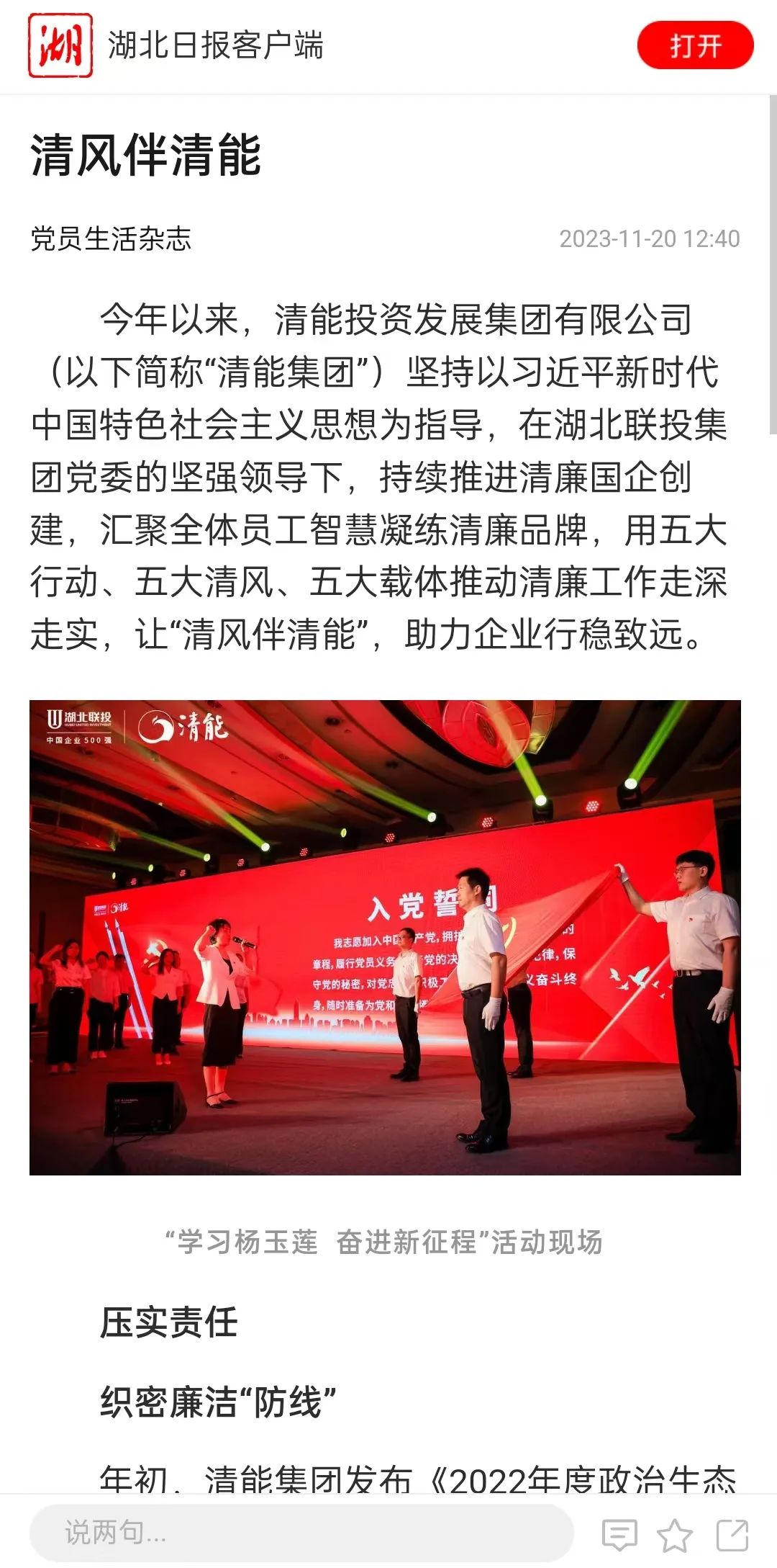 今年以來,聯(lián)投·清能投資發(fā)展集團(tuán)有限公司(以下簡(jiǎn)稱“清能集團(tuán)”)堅(jiān)持以習(xí)近平新時(shí)代中國(guó)特色社會(huì)主義思想為指導(dǎo),在湖北聯(lián)投集團(tuán)黨委的堅(jiān)強(qiáng)領(lǐng)導(dǎo)下,持續(xù)推進(jìn)清廉國(guó)企創(chuàng)建,匯聚全體員工智慧凝練清廉品牌,用五大行動(dòng)、五大清風(fēng)、五大載體推動(dòng)清廉工作走深走實(shí),讓“清風(fēng)伴清能”,助力企業(yè)行穩(wěn)致遠(yuǎn)。
