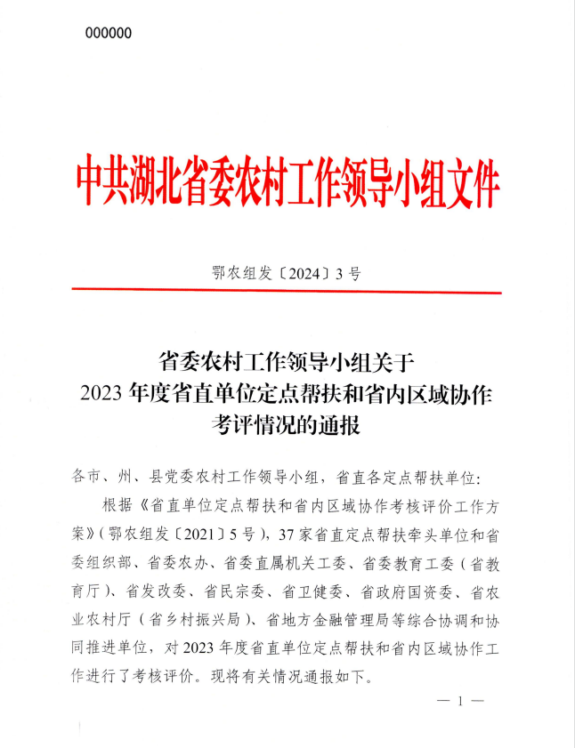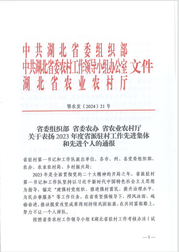 同時,省農(nóng)業(yè)農(nóng)村廳印發(fā)的省委組織部、省委農(nóng)辦、省農(nóng)業(yè)農(nóng)村廳《關(guān)于表揚(yáng)2023年度省派駐村工作先進(jìn)集體和先進(jìn)個人的通報》(鄂農(nóng)發(fā)[2024]21號),湖北清能投資發(fā)展集團(tuán)有限公司榮獲“2023年度工作突出派出單位”。